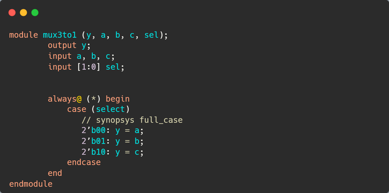 - Verilog에서 //synopsys full_case 지시어는 모든 가능한 경우를 포함하도록 case 문을 지정하는 데 사용됩니다. 이는 잠재적인 래치(latch) 생성을 방지하기 위해 사용됩니다. 예를 들어, case 문에 모든 가능한 조건을 포함하지 않으면 래치가 생성될 수 있습니다. full_case 지시어는 이러한 상황을 피하기 위해 사용됩니다.