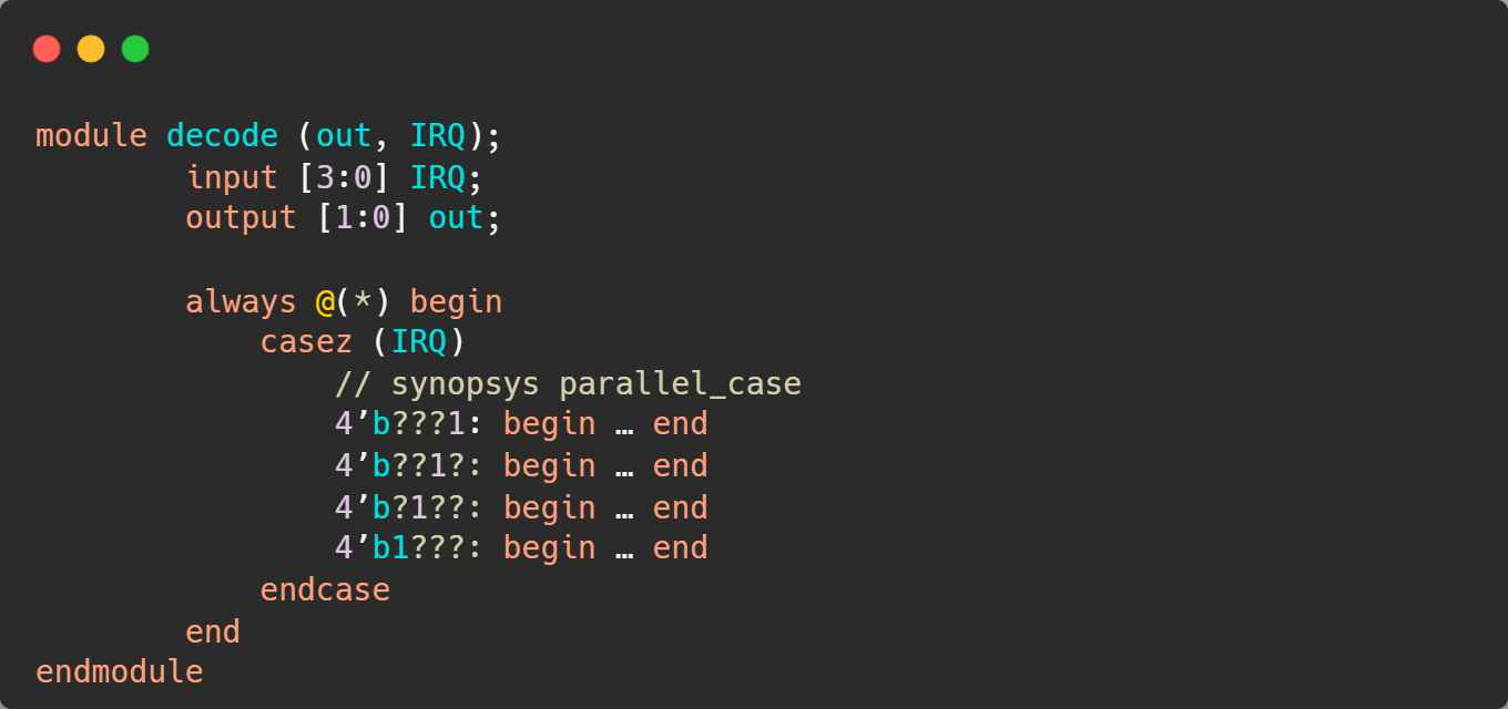 위 두 full_case와 parallel_case 지시어를 사용할 때는 주의가 필요합니다. 잘못 사용하면 시뮬레이션과 합성 결과가 다를 수 있습니다